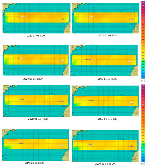 In the current analysis, the GRIB files were downloaded for the period from 3 up to 10 January 2020, with 0.25° × 0.25° grid spacing, 3-hour forecast interval, and two observation periods equal to 1 and 7 days, respectively. The free software XyGrib, able to download and show the meteorological data, was embodied to obtain the GRIB files. An example of the images providing the changes of the environmental conditions in the selected area is reported in Figure 3, that provides a series of GRIB files showing the time trend of the significant wave height, H s = H s , w i n d 2 + H s , s w e l l 2 from 06:00 UTC (Coordinated Universal Time) on 3 January 2020 up to 03:00 UTC on 4 January 2020, where the wind wave (swell) component is denoted by H s , w i n d ( H s , s w e l l ).