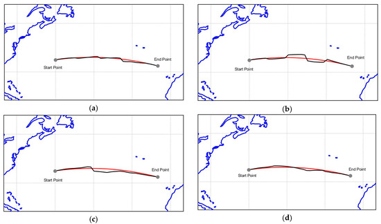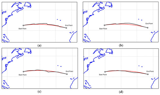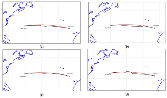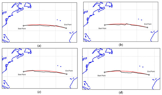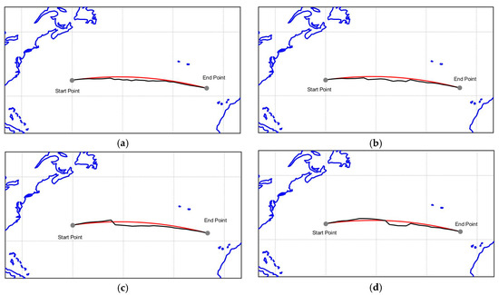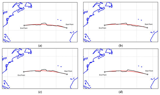 Figure 8. Minimum distance (great circle) and optimal route detection, FN = 0.24: (a) Case 1; (b) Case 2; (c) Case 3; (d) Case 4.