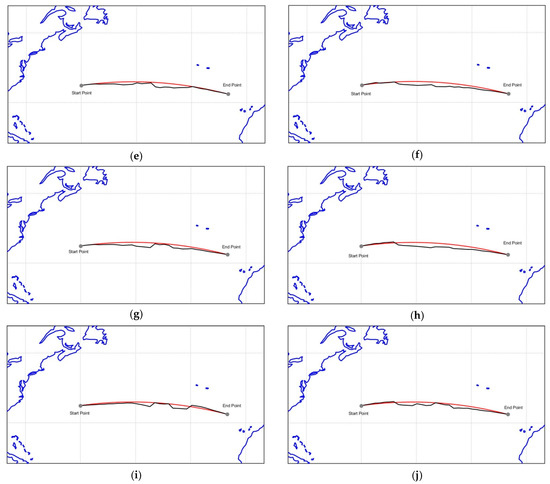 In this respect, Figure 4a–d provide the optimal routes with reference to the four selected conditions. In all cases, the great circle route is highlighted in red, the optimum route is depicted in black, while the grey circles represent the starting and the ending points. Besides, Table 3 provides the difference, Δ c , between the great circle and optimum route, that maximizes the ship performances, together with the percentage variation, Δ S P I , of the Seakeeping Performance Index ( S P I ) , as regards the values corresponding to the great circle route. Based on the current results, the percentage increase of the route length ranges from 1.1% up to 2.7%, while the S P I increase is much higher and ranges from 10% up to 40%. These results clearly show that the ship seakeeping performances can be highly improved, without significantly increasing the voyage length and, consequently, the fuel consumptions.