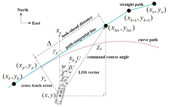 According to the cascade property, the hierarchical technique has been widely concerned for control system implementation of the marine vessels [2,3,4,5,6,7,8]. For a hierarchical control structure, the kinematics controller, which is also known as the guidance law, is first proposed for desired path-following performance, while the dynamics controller is then designed to enable the vehicle to track the command course angle of the guidance law. The line-of-sight (LOS) guidance law was originally proposed in [9] and quickly becomes widely used in the aspect of vehicle path-following control. In [10], the LOS guidance algorithm has also been extended to the aspect of obstacle avoidance.
