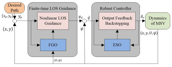 The control objective of this work is motivated in the following two aspects: first, the command course angle is designed to stabilize the error system shown in Equation (8) based on the finite-time LOS guidance algorithm; Secondly, the ESO-based output feedback backstepping controller is presented to enable the yaw angle to track of LOS guidance strategy quickly and accurately. The hierarchical control structure is shown in Figure 2.