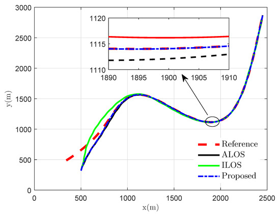 Path control performance comparisons of proposed method, ALOS and ILOS-based method.