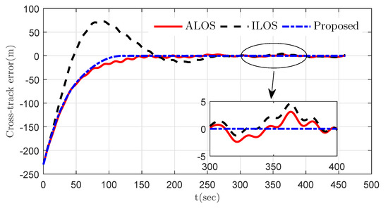 Cross-track error comparisons of proposed method, ALOS and ILOS-based method.