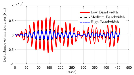 The control system performance with different design parameters is also analyzed in the simulations. The FGO and ESO play a very important role in the control system, we first analyze the performance of proposed LOS guidance algorithm with different gains of FGO. Three sets of gains for FGO are selected as follows: (1) low gains , , (2) medium gains , , (3) high gains , . The control performance of these three set of parameters are compared in Figure 9. From Figure 9, we can see that the cross-track error with low FGO gains is higher than that with medium FGO gains, which indicates that higher gains will increase the control accuracy under steady-state. However, it is also shown that the high gains will bring the system will vibration with sudden changes of environment, such as external disturbances or path curvature. For the autopilot of the vessel dynamics, the disturbance and state estimation effect will largely determine the tracking performance of the command course angle. Three sets of bandwidth parameters for ESO are chosen as follows: (1) low bandwidth rad/s, (2) medium bandwidth = 30.0 rad/s, (3) high bandwidth = 40.0 rad/s. The disturbance estimation error is compared in Figure 10. It can be seen that the estimation accuracy is mainly determined by the bandwidth of the ESO. Higher bandwidth will decrease the disturbance estimation error. However, the bandwidth is a trade-off between the robustness and performance of the closed-loop system, which is limited by the system uncertainties and measurement noise. In this simulation case, if the bandwidth is higher than 40.0 rad/s, the closed-loop system will be instable. According to the analysis above, empirical parameters should be selected to balance the control performance between the steady and transient state under the robustness condition.
