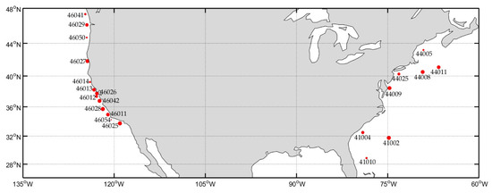The present study utilizes modelled hindcast data from several wave model studies to estimate extreme wave statistics: a WWIII 30-year model (v.5.08) hindcast study encompassing all US coastal waters with a spatial resolution of 4 minutes (6–7 km) [28], a high-resolution regional SWAN 32-year model hindcast study for the US West Coast with a spatial resolution of 200–300 m [20], and a high-resolution regional SWAN 32-year model hindcast study for the US East Coast with a spatial resolution of 200 m for coastal areas extending 20 km offshore and a resolution of 1–3 km for the inner-shelf regions [21,29]. At thirty years or more, these model hindcasts exceed minimum requirements for estimating extreme wave heights with return periods up to fifty years. and time series outputs from these model hindcasts at three-hour intervals are used to estimate and and environmental contours for comparison with those derived from measured (observation) (, ) time series at NDBC stations at eight sites along the East Coast and thirteen sites along the West Coast. For the initial comparison with observation-derived estimates, the model-derived time series are limited to the observation POR at each station. These POR-limited model-derived estimates are also used to determine the linear correction, to adjust raw model-derived estimates to better match observation-derived values.