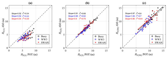 Scatter diagrams comparing estimates at all buoy stations using the annual maxima (AM) and peak-over-threshold (POT) methods applied to the same data source (buoy observations, WWIII hindcast predictions, SWAN hindcast predictions): (a) ; (b) ; (c) . Note that, for these comparisons, the periods of record of model-derived data sources were reduced to match those of the observation-derived data sources for each buoy station given in Table A1, Table A2 and Table A3.
