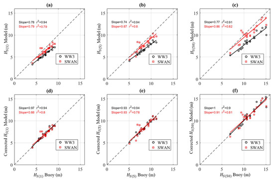 Scatter plots at twenty-one NDBC stations comparing , , and derived from models with those derived from in-situ observations at NDBC stations. Black circles indicate a comparison of WWIII model-derived values with observation-derived values. Red squares indicate a comparison of SWAN model-derived values with observation-derived values. Dashed lines represent lines of equivalence. Solid lines represent lines of best fit from linear regression: (a), raw models vs. buoy (POT method); (b), raw models vs. buoy (AM method); (c), raw models vs. buoy (AM method); (d), corrected models vs. buoy (POT method); (e), corrected models vs. buoy (AM method); (f), corrected models vs. buoy (AM method). Note that raw estimates (a–c) are adjusted by linear correction with scaling factor, s, using (1) to generate corrected estimates (d–f). Note that, for these comparisons, the periods of record of model-derived data sources were reduced to match those of the observation-derived data sources for each buoy station given in Table A1, Table A2 and Table A3.