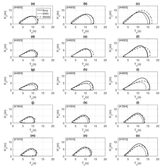 Comparison of environmental contours at five selected East Coast buoy stations based on three different data sources: buoy observations (solid line), WWIII (dotted line) and SWAN (dashed line). Each row shows contours at a given buoy station at latitudes in descending order from north to south, and 1-, 5- and 50-year contours shown from left to right: (a) 44005, 1-year; (b) 44005, 5-year; (c) 44005, 50-year; (d) 44025, 1-year; (e) 44025, 5-year; (f) 44025, 50-year; (g) 44009, 1-year; (h) 44009, 5-year; (i) 44009, 50-year; (j) 41004, 1-year; (k) 41004, 5-year; (l) 41004, 50-year; (m) 41010, 1-year; (n) 41010, 5-year; (o) 41010, 50-year.