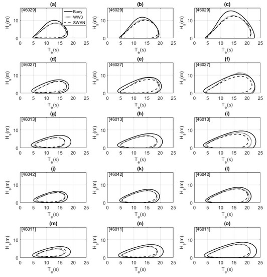 Comparison of environmental contours at five selected West Coast buoy stations based on three different data sources: buoy observations (solid line), WWIII (dotted line), and SWAN (dashed line). Each row shows contours at a given buoy station at latitudes in descending order from north to south, and 1-, 5- and 50-year contours shown from left to right: (a) 46029, 1-year; (b) 46029, 5-year; (c) 46029, 50-year; (d) 46027, 1-year; (e) 46027, 5-year; (f) 46027, 50-year; (g) 46013, 1-year; (h) 46013, 5-year; (i) 46013, 50-year; (j) 46042, 1-year; (k) 46042, 5-year; (l) 46042, 50-year; (m) 46011, 1-year; (n) 46011, 5-year; (o) 46011, 50-year.