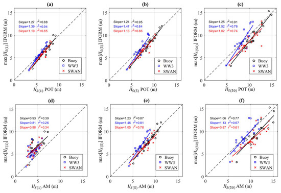 Comparison of the maximum values of on each contour with values derived using univariate methods for all buoy stations. Peak-over-threshold (POT) method: (a) ; (b) ; (c) . Annual maxima (AM) method: (d) ; (e) ; (f) .
