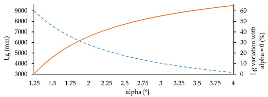 Variation of Lg with the conical angle of the connection (dashed line) and the percent difference between Lg (α = i) and Lg (α = 0) (solid line).