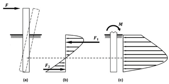 (a) Deflection of a rigid monopile when subjected to a horizontal loading; (b) representation of generic soil reactions to a rigid monopile; and (c) representation of the resulting bending moment on the rigid monopile.