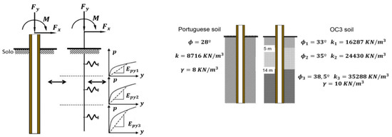 The p-y curves are specific for each depth, which means the piles are usually modeled as beams supported by a series of non-linear decoupled elasto-plastic springs, which simulate soil reactions, as shown in Figure 6. Figure 6 also presents the two different soils evaluated during this research, with the respective soil parameters. The first soil simulated a traditional Portuguese soil, as indicated by LNEC (the Portuguese Civil Engineering Laboratory), while the second considered the soil distribution detailed by the OC3 consortium [33]. This soil was divided into three different layers, with their interfaces at 5 and 14 m below the seabed floor. Figure 7 presents the p-y curves for the two evaluated soils, at different depths. The analysis clearly showed that the OC3 soil is stiffer than the Portuguese one.