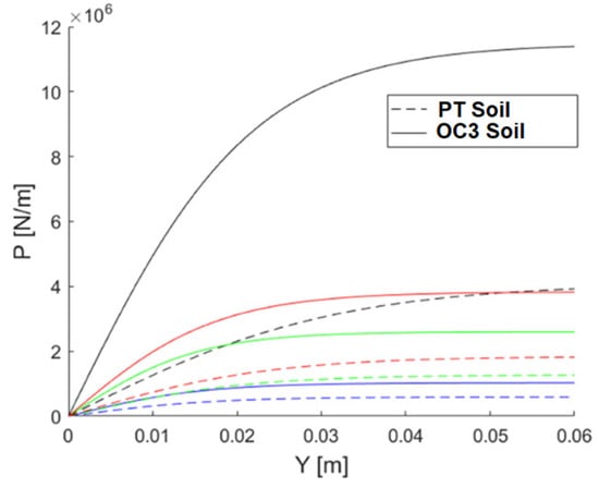 Different p-y curves at different depths for the two studied soils—bigger depths (Y) are related with bigger soil reactions (P).