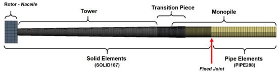 The finite element commercial software ANSYS possesses a one-dimensional finite element that can implement spring loadings with non-linear deflections, notably the COMBIN39 element. Furthermore, the element can behave linearly during the unload phase, which means that the loading history will produce irreversible strains, thus considering accumulated plasticity on the soil. These COMBIN39 elements were coupled with pipe elements (PIPE288) that simulate the length of the monopile which is penetrated into the seabed soil. The connection between the CAD models above the seabed and the PIPE288 elements below seabed was guaranteed using a fixed joint connection, with no relative displacements or rotations allowed. In addition, the springs obtained from the p-y model were distributed on the penetrated pile with a distance of 1 m between each other. The use of PIPE288 is adequate for slender structures and is based on the Timoshenko beam theory; it is an element with six degrees of freedom at each node, with great applicability in bending, torsion, and axial loadings, for both linear and big deformation settings [39]. The three-dimensional components of the model were modeled using a SOLID187 finite element.