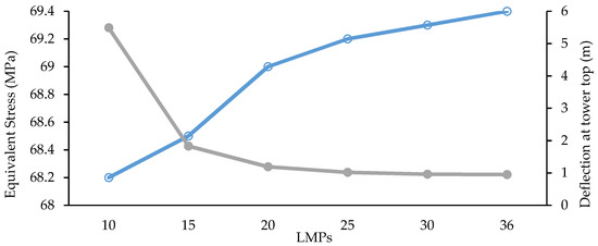 Considering the environmental loading conditions presented in Table 2, the final length for the monopile was achieved by guaranteeing the static equilibrium and by avoiding excessive stresses on the pile. The static equilibrium was easily achieved, even for values of penetrated length of 10 m. In addition, the maximum stresses registered on the pile, presented on Figure 9 for static analyses, comply with the standard even for depths of only 10 m. Nonetheless, the maximum deflections registered on the tower top for the lower depths are not acceptable for wind turbine operation (at more than 5 at 10 m depth, as shown in Figure 9). Then, the length considered throughout the research was 36 m below the seabed, to match the depth defined by NREL.