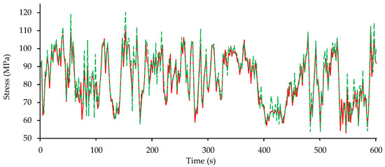 Registered stress series on the dynamic analysis for the monopile, with the axial stresses for Pt0 (solid line) and the axial stresses for Pt7 (dashed line).