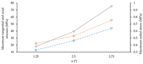 Maximum stresses on the grout material at the three directions: tangential (point line), axial (solid line), and radial (dashed line).