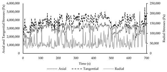 Stress series registered during the dynamic analysis for the grout connection, with the axial stress (point line), tangential stress (dashed line), and radial stress (solid line).