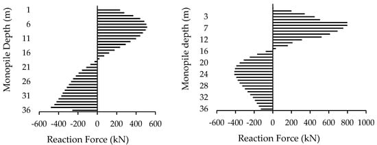 As detailed above, stresses on the penetrated part of the monopile were evaluated using specific finite elements—PIPE288 from ANSYS. Figure 17 and Figure 18 present the reaction forces and the horizontal deflections registered on models Pt0 and OC0, under the same static loading, respectively.