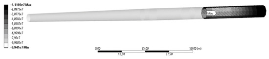 Dynamic analyses were produced using the model presented in Figure 8, for different pile–soil interaction conditions and assuming structural displacements obtained from DLC 1.1 tested using FAST. These are time-based transient analyses that consider inertia effects. These analyses essentially provide an overview of the stress distribution along the monopile, the transition piece, and the tower. The connection between the transition piece and the tower was simplified; thus, the bolted flange connection was not evaluated in this research.