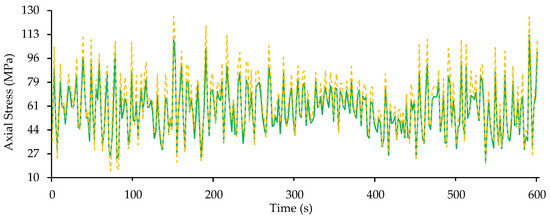 The stress results from the dynamic analysis of the 1.25° grout connection are presented in Figure 16, which presents the maximum stress values of , and . All of these stresses are below the 25 MPa limit, although the axial stress is close to it. This result highlights the problems that these types of connections have been demonstrating in real offshore wind conditions.