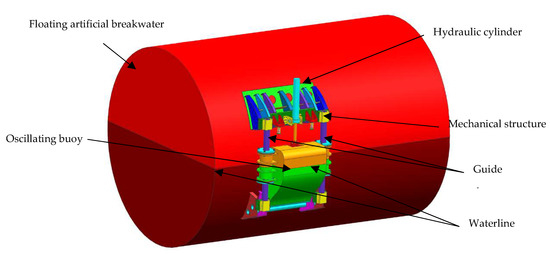 The WEC mainly includes three parts: oscillating buoy, mechanical structure and hydraulic PTO. The designed buoy is the first stage energy converter device of WEC. The oscillating buoy is used to convert the wave energy to kinetic energy. The main body of the mechanical structure is mainly for connecting the buoy and hydraulic system, and provides reliable support for the hydraulic PTO and the buoy. The mechanical body also connects the WEC smoothly with the breakwater, which is the basis of ensuring the stable operation of the WEC. The displacement of the buoy is limited by the guide rails on both sides, which ensures that the buoy can move up and down steadily under the action of waves to extract the energy transmitted by waves, and then the wave energy in marine wave can be converted into the kinetic energy of the buoy through reciprocating motion. In addition, the floating breakwater is moored to the seabed, so it assumes that the buoy heaves only with a wave. The hydraulic PTO part is composed of hydraulic components such as a hydraulic cylinder and hydraulic motor. The function of a hydraulic cylinder is mainly to convert the kinetic energy transmitted by the oscillating buoy into hydraulic energy, and further convert the power through the rotary generator connected by the hydraulic motor. The main body of the hydraulic PTO is placed inside the floating artificial breakwater and connected with the hydraulic cylinder through the hydraulic pipeline.