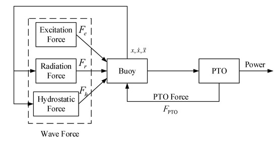 Therefore, the designed WEC system can be analyzed by the force analysis revealed in Figure 2. The WEC model mainly includes the following forces: wave excitation force fe, PTO force fPTO, radiation force fr caused by radiation waves, and hydrostatic force fh in waves.