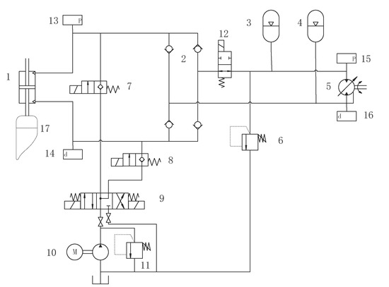 In the Figure 6, 1 is a hydraulic cylinder, 2 is a rectifying circuit composed of a one-way valve, 3 is a high-pressure accumulator, 4 is a low-pressure accumulator, 5 is a variable hydraulic motor, 6 is the PTO system relief valve, 7 and 8 are electromagnetic ball valves that are inserted into check valve, 9 is an electromagnetic reversing valve, 10 is the pump station, 11 is the relief valve of pump station, 12 is an electromagnetic ball valve used in extreme sea conditions, 13–16 are the hydraulic pressure sensor and 17 is the oscillating buoy.