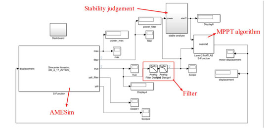 The diagram of simulation in Simulink, including modules of AMESim, stability judgment, filter and the MPPT algorithm compiled by MATLAB.