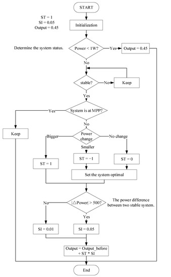 The diagram of simulation used in Simulink is shown in Figure 8. The control flow of the MPPT algorithm designed in this paper is shown in Figure 9. The variable step hill-climbing method was used in the MPPT control algorithm in which the big step can reduce the time of tracking and the small step can lift the convergence of MPPT control algorithm. Different from the traditional hill-climbing algorithm, the hill-climbing algorithm designed in this paper introduced a variable step size method, and a stable algorithm for detecting the system, further optimizing the algorithm execution rate and improving the accuracy.