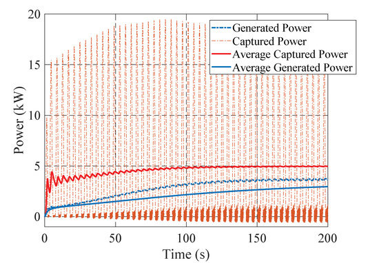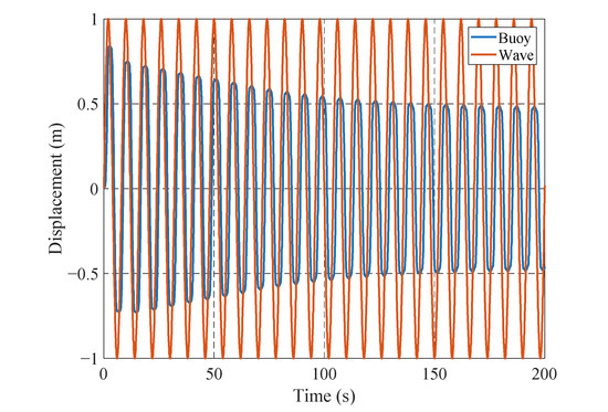 Furthermore, the linear PTO can be analyzed by MATLAB/simulink software to obtain the response of the system with damping coefficient C = 50 kNs/m and spring coefficient K = 0, as shown in Figure 5. The displacement of buoy was 0.5 m, and the average power was 3 kW.