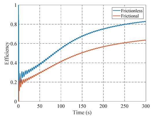 Due to the influence of friction mentioned above, there was a certain gap between the efficiency with and without friction as the Figure 14 demonstrated. The PTO efficiency will change near the red line by changing the parameters of the hydraulic system, but it will not exceed the blue line, which is frictionless.