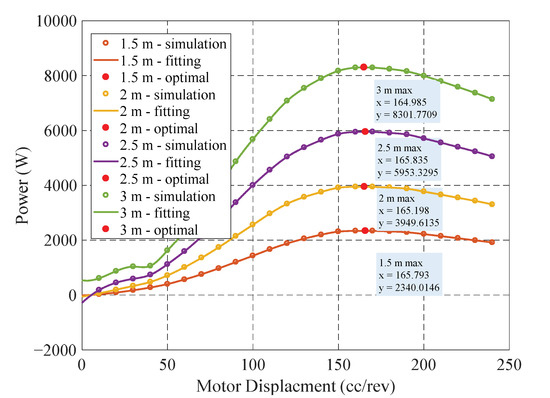 By changing the wave height with a fixed wave period of 8 s, the optimal generated power under different wave height can be obtained as shown in Figure 15. It can be seen in the Table 1 that under the wave period 8 s, the optimal generated power point of hydraulic PTO was almost the same, that is 165 cc/rev. Therefore, the optimal damping point would not be affected by the wave height. Additionally, the maximum generated power had a linear relationship with the wave height.