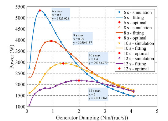 For the PTO system, there is an optimal damping point, which could be found in certain sea conditions. For the linear PTO system modeled in Section 3.1, the damping coefficient could be optimized. Additionally, for the hydraulic PTO system designed in Section 3.2, there is also an optimal damping including the motor displacement, generated damping and other hydraulic components. However, components such as hydraulic cylinders, hydraulic oil pipes and accumulators in the hydraulic system cannot be changed in the actual conditions. Not only that, but the parameters of the generator in the actual power generation system are also difficult to change.