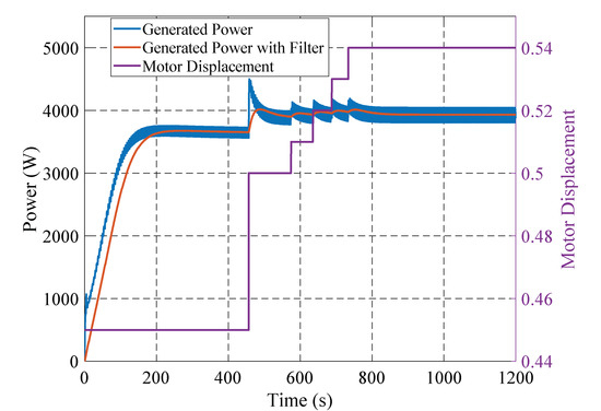 Additionally, the MPPT control based on the hill-climbing method was designed to maximize the generated power. The control flow of the MPPT algorithm was provided. The filter method was used to ensure the operation of the MPPT algorithm, because there were some fluctuations in the generated power due to the inability of the accumulator to be infinite. Additionally, in the MPPT algorithm, we introduced the interrupt condition to ensure that the simulation could converge in an effective time, which also guaranteed that the output of hydraulic PTO was continued at a higher level.