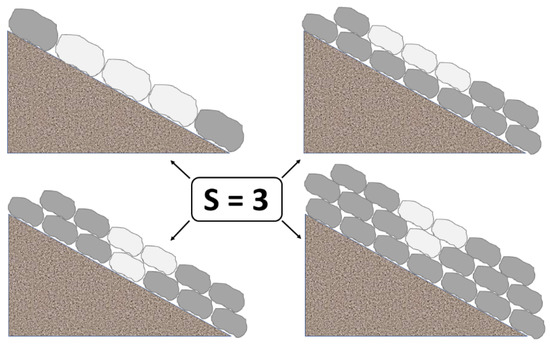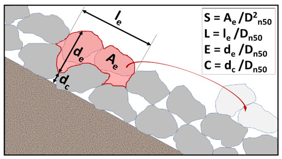 A physical description of S is the number of eroded cubic pieces with a side of Dn50 within a width of one Dn50. The actual number of eroded units depends on the porosity, armor grading, and shape of the stones but, according to Van der Meer [24], it is equal to 0.7 to 1 times the value of S.