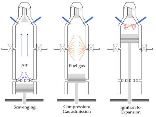 For that reason, liquefied natural gas (LNG) began to attract attention as a ship fuel [4,5]. During this period, various gas engines using natural gas (NG) for marine purpose emerged as new propulsion systems with high efficiency and low operational costs instead of steam turbines [6]. In other words, the Otto-cycle engine, which is one of the gas engine types, has begun to replace the existing ship propulsion system, the steam turbines. Figure 1 shows the concept of the Otto-cycle engines. During compression stroke in the Otto-cycle engines, low-pressure fuel gas is injected from the middle of the cylinder liner to perform the compression stroke in the premixed state with the scavenging air. Then, at the end of the compression stroke, combustion proceeds by injecting the fuel for the ignition through fuel valves installed on the upper part of the cylinder head.