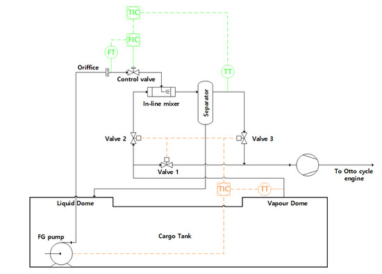 The proposed MN control system shown in Figure 2 consists of an orifice, an in-line mixer, a flow control valve, an LNG supply pump, and a separator. The main idea to remove C2+, such as ethane and butane, which lowers MN from NG, is to spray cold LNG to NG to lower the temperature of the fluid stream. If the cargo tank temperature is near −80 °C, taking into account the boiling point of each gas, an in-line mixer should be operated to remove C2+ from the NG. For use of the in-line mixer, valves 2 and 3 are opened and valve 1 is closed. When the temperature of NG is lowered to about −100 °C, C2+ may condense. As opposed to the use of an in-line mixer, valve 1 is opened, and valves 2 and 3 are closed. The condensed gas is divided inside of a separator and returned to the cargo tank, and only NG with a high MN value is sent to the fuel gas supply system. The high MN gas is supplied to Otto-cycle engines through the fuel gas supply system, which is effective in preventing phenomena such as knocking. It is advantageous from an OPEX perspective. In addition, this Otto-cycle engine has an inherent to reduce the formation of NOx by up to 90% compared to the diffusion combustion of the diesel [7].