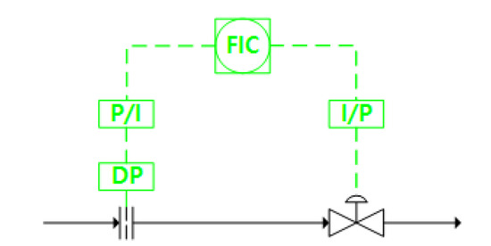 The flow control system consists of a flowmeter, a differential pressure cell, a P/I (pressure to current) transducer, a flow controller, an I/P (current to pressure) transducer, and a control valve actuator, as shown in Figure 4.