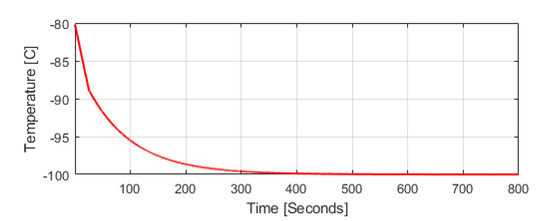 The in-line mixer property is indicated by the temperature curve for adjusting the LNG mass flowrate, which can ensure the downstream temperature of the in-line mixer for the NG is −100 °C, ensuring the MN is 80 or above. For simulating how much LNG is required for cooling the NG, HYSYS (Aspen Technology, Massachusetts, USA) dynamic simulation is used. The NG mass flowrate is calculated based on cargo tanks’ maximum boiled-off rate (BOR) in the stable tank condition, referring to Gaztransport & Technigaz (GTT) information [23]. When the flowrate of the NG generated from the cargo tanks flows to the in-line mixer, the LNG flowrate that must meet the MN is sprayed through the nozzle. The temperature trend curve of the in-line mixer downstream was implemented in an HYSYS dynamic simulation, as shown in Figure 7. This curve was transformed into Equation (11) using system identification in MATLAB Simulink (MathWorks, Massachusetts, USA). For creating a transfer function of the in-line mixer, time domain data were used with the same time interval. The measured input (LNG mass flowrate) and the measured output (downstream temperature of the in-line mixer) were the independent variables, and the dependent variables were the predicted outputs. Equation (3) can be used to predict the parameters of the model [24,25,26].