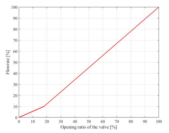 The control valve is an important element in process industries. If the actual LNG flow is not properly controlled, even if the measurement is good, problems will arise in temperature control. The flow coefficient (Cv) is the key element for controlling the valve with the proper opening ratio. If the flow coefficient is higher than the system requirement, the control valve cannot be operated properly. This means that the temperature control fails because a large control valve can allow large amounts of LNG to cool the boil-off gas (BOG) with small movements of the actuators. Therefore, the characteristic curve of the control valve is used for making a transfer function. The characteristic curve of the control valve indicates the relationship between the flow rate through the valve and the position of the stem that changes the valve from 0% to 100% [27].