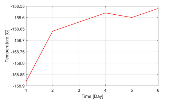 Disturbances can occur for both the primary control loop and the secondary control loop. A primary disturbance is caused from abrupt temperature changes in the NG of cargo tanks. The abrupt temperature change can be ignored considering the size of the cargo tanks of LNG carriers. The cargo tank size of an LNGC currently varies from 140,000 to 260,000 m3. Figure 9 shows the temperature changes in a cargo tank of an actual LNGC equipped with 140,000 m3 cargo tanks. The average temperature for six days changed from −158.88 to −158.56 °C. Considering this trend of temperature change, we assumed that primary disturbance could be ignored.