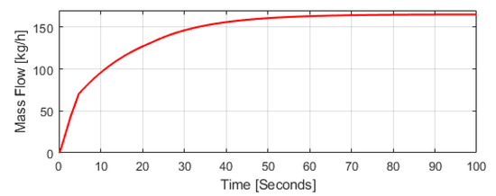 Mass flowrate over time was determined using HYSYS dynamic simulation for the initial start of the FG pump using the characteristic curve of this pump. Figure 11 shows how much LNG is sprayed at the in-line mixer for adjusting the NG temperature. The actual mass flowrate requested for MN control ranges from 0 to about 160 kg/h. During this cooling, the sampling time applied is 0.2 s. The transfer function of the secondary disturbance can be inferred from Equation (13) using the system identification in Figure 11.