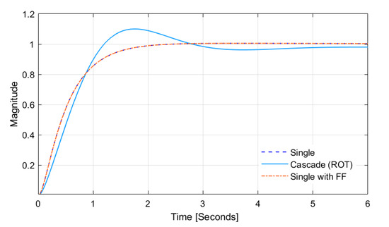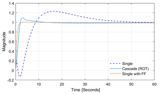 We first examined reference tracking using a step signal. The tracking results without the disturbance should be almost same between a single PI controller and cascade controllers tuned by ROT. However, to clearly differentiate the performance of the controller against disturbance, the performance of the single controller without disturbance should be better than cascade controllers as shown in Figure 13. We did not directly compare the single PI controller with feed-forward and cascade controllers, but the findings show how effective these two controllers are in eliminating a disturbance.