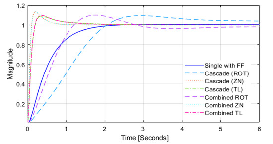 4.2. Comparison between a Single PI Controller with Feed-Forward, Cascade Controllers, and Combined Cascade/Feed-Forward Controllers
