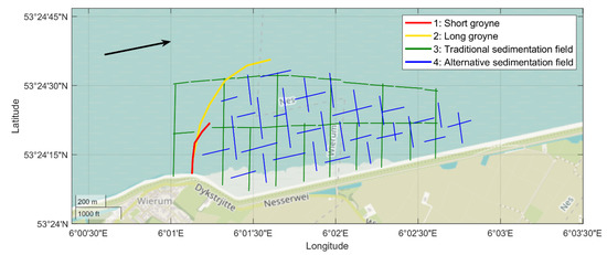 Sedimentation fields are implemented in combination with the groynes. These sedimentation fields are constructed of brushwood groynes (Figure 3e) and have the specific purpose to reduce flow velocities and attenuate waves on, and in front of, a salt marsh to stimulate local sedimentation [33]. Short + Traditional is a combination of the short groyne and a sedimentation field with a traditional shape (Figure 3c,e) representing the structures present at the study area in the past. Long + Alternative is a combination of the long groyne with a configuration of an alternative sedimentation field proposed by local authorities (Figure 3f). This configuration is presumed to stimulate natural salt marsh morphology.