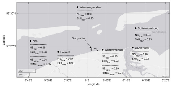 In addition, the simulated hydrodynamics will be validated by comparing the output with observed historical water levels at all available measurement stations within the model domain. For validation of the water levels, this will be performed using the ‘index of agreement’ (Skill) focusing on mean values [56,57] and with the NS, which focuses on extremes [55]. The data will be compared with a five-minute interval. Validation at the location nearest to the area of interest is performed for November 2017 due to data availability. The wave module will be validated similarly, based on the wave heights. This will be performed with the NS and the root mean square error (RMSE). This comparison will be based on hourly data.