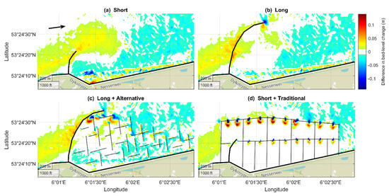 Simulated change in bed level within the study area for the structures (a) Short, (b) Long, (c) Long + Alternative, and (d) Short + Traditional. Hard structures in the simulation are depicted by black lines. The arrow indicates the dominant direction of tidal flow and alongshore transport. The lee side is on the right of the structures.