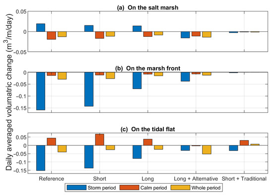 Daily and width averaged simulated volumetric change (a) on the salt marsh, (b) on the salt marsh front, and (c) on the tidal flat. The storm period is the combined bed level change during the storms of 4–5 October and 28–29 October. The calm period is from 9 to 22 October. The whole period is for the whole simulated month. “Reference” displays results of the simulation without artificial structures.